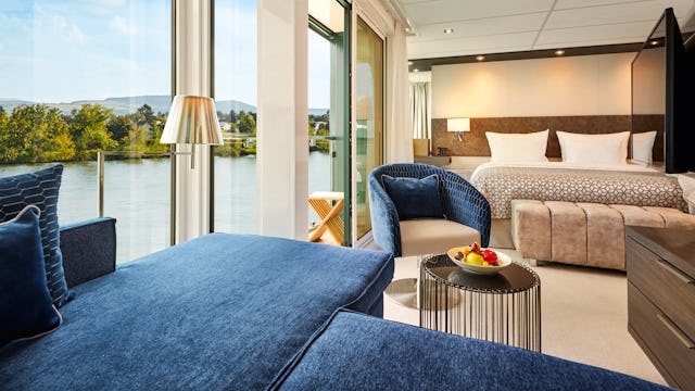 ✓ Luxuriöse Unterkunft in der gebuchten Kabine mit Flussblick, überwiegend mit absenkbarer Panorama-Fensterfront* und in den Suiten mit begehbarem Außenbalkon*
