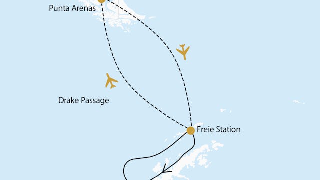 7. Tag: Planmäßiger Rückflug aus der Antarktis - Kehren Sie zur King George Insel zurück und nehmen Sie Abschied von der Antarktis, bevor Sie den Rückflug nach Punta Arenas antreten. Nach der Ankunft erfolgt der Transfer zu Ihrem Hotel für die Nacht. (Hinweis: Die Mahlzeiten in Punta Arenas stehen Ihnen zur freien Verfügung und sind nicht im Programm enthalten).