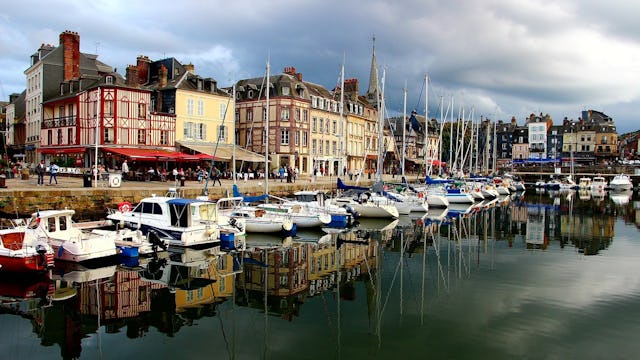 Der Rundgang führt Sie, jeweils mit kurzem Aufenthalt, zum berühmten „Vieux Bassin“ (dem alten Hafen), dem Gebäude der Statthalterei, von wo Samuel de Champlain startete, um Kanada zu entdecken, und weiter zu den alten Salzhäusern sowie der Katharinenkirche mit ihrer ungewöhnlichen Architektur und separatem Glockenturm — von Seefahrts-Zimmerleuten erbaut. Heute gibt es Dutzende von Galerien und Künstlerateliers mit einer großen Auswahl an klassischen und modernen Gemälden in der Stadt. Honfleur ist auch der perfekte Ort, um lokales Kunsthandwerk und Spezialitäten wie Cidre, Calvados oder Karamell zu kaufen. Besuchen Sie daher den Markt und verkosten dort ein Stückchen der köstlichen französischen Crêpe oder Sie verbringen Ihre Freizeit einfach in einem der kleinen Cafés und genießen die schöne Atmosphäre. Eine Chanson-Darbietung an Bord sorgt für den passenden Tagesabschluss.