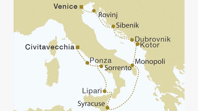 Italiens sieben vulkanischen Äolischen Inseln, direkt vor der Nordküste Siziliens, sind ein wahres Paradies. Auf Lipari können Sie durch die engen Gassen zum mittelalterlichen Castello hinaufwandern und an einem abgelegenen Strand entspannen. Wenn die Royal Clipper an der Isola Stromboli vorbeisegelt, halten Sie Ausschau nach den beeindruckenden vulkanischen Feuerwerken, die der Himmel oft in spektakulären Ausbrüchen erleuchtet. (F/M/A)