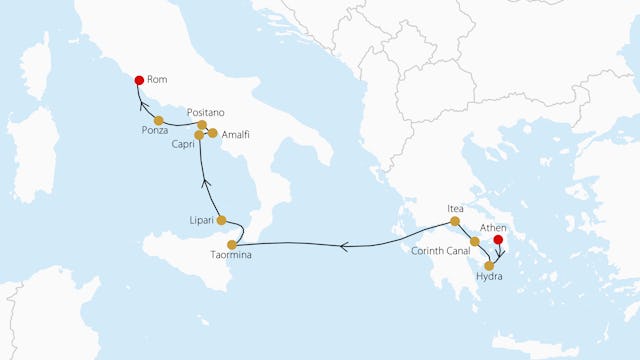 Geheimnisse flüsternde antike Mauern, malerische Inselperlen und romantische Städtchen bilden die Kulisse für Ihre Route zu den schönsten Orten Italiens und Griechenlands. Mit mediterraner Leichtigkeit passieren Sie den faszinierenden Kanal von Korinth, sonnen sich an weißen und schwarzen Stränden, erblicken majestätische Vulkane und schlendern durch idyllische Gassen.