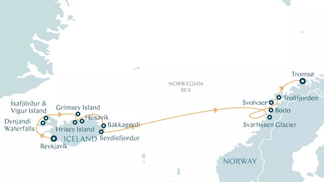Von den vulkanischen Küsten Islands über das Insellabyrinth der Lofoten bis hin zur Mitternachtssonne Tromsøs zeigen sich Ihnen auf dieser Route die Kräfte der Natur in ihrer reinsten Form. Mal begleitet von majestätischen Walen, mal Auge in Auge mit Papageientauchern oder mit den Füßen auf dem Arctic Circle werden Entdeckerträume wahr.