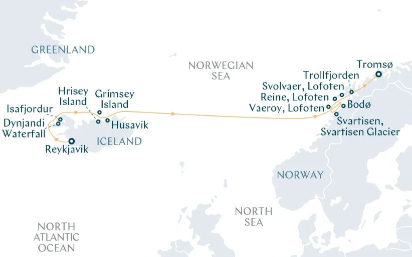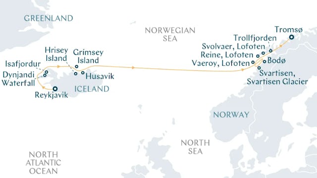 Von den vulkanischen Küsten Islands über das Insellabyrinth der Lofoten bis hin zur Mitternachtssonne Tromsøs zeigen sich Ihnen auf dieser Route die Kräfte der Natur in ihrer reinsten Form. Mal begleitet von majestätischen Walen, mal Auge in Auge mit Papageientauchern oder mit den Füßen auf dem Arctic Circle werden Entdeckerträume wahr.