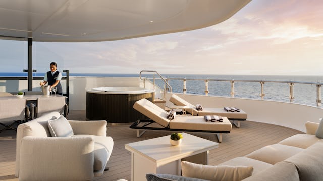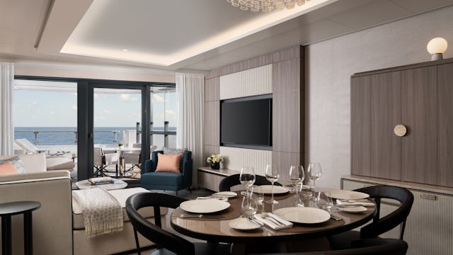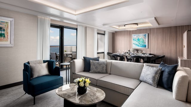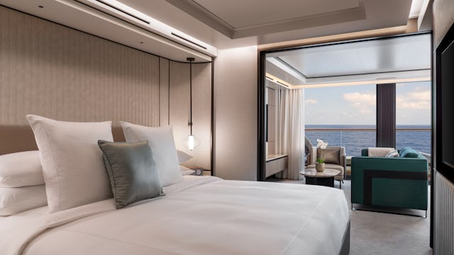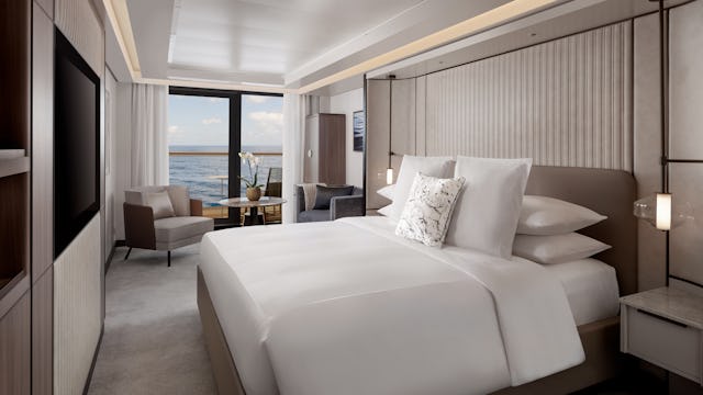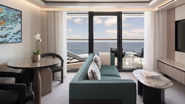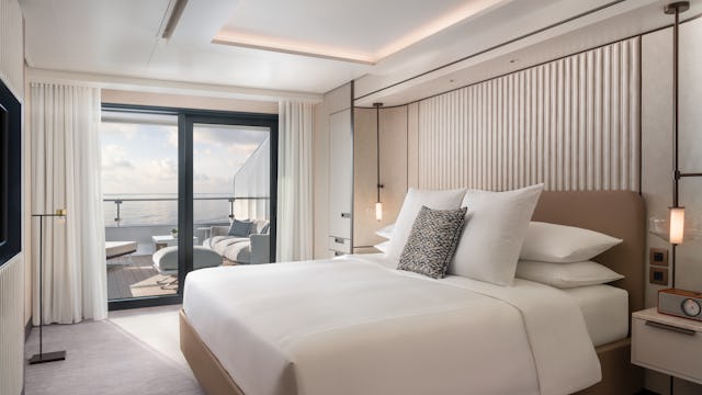 Auf rund 27 m² vereinen die Terrace Suites schlichte Eleganz mit zeitgenössischem Design und bieten alle luxuriösen Annehmlichkeiten, die die Suiten an Bord auszeichnen. Durch die bodentiefen Fenster fällt bereits am Morgen das sanfte Licht des Ozeans ein, während Sie in Ihrem maßgeschneiderten Kingsize-Bett erwachen und den neuen Tag willkommen heißen. Das stilvolle Badezimmer schafft eine Wellness-Oase, in der Sie sich nach einem ereignisreichen Tag an Land oder auf See erfrischen können. Für noch mehr Platz lassen sich ausgewählte Terrace Suiten mit einer benachbarten Suite verbinden und zu einem erweiterten Wohn- und Essbereich oder einem zweiten Schlafzimmer umgestalten – perfekt für Familien oder Gäste, die gemeinsam reisen.