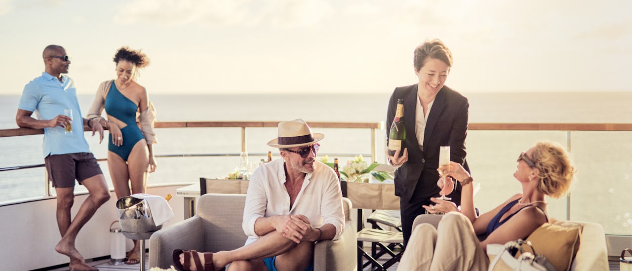 An Bord gibt es eine große Auswahl an Aktivitäten, sowohl an Bord als auch außerhalb des Schiffes. An Bord können Sie die Marina nutzen, einen Bereich am Heck des Schiffes, von dem aus Sie direkt ins Meer springen können, wenn Sie vor Anker liegen. Auf der nahe gelegenen Marina-Terrasse finden Sie zahlreiche Liegestühle, einen Infinity-Pool und zwei Whirlpools.