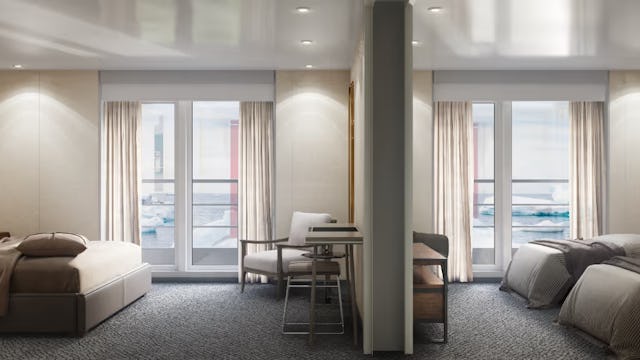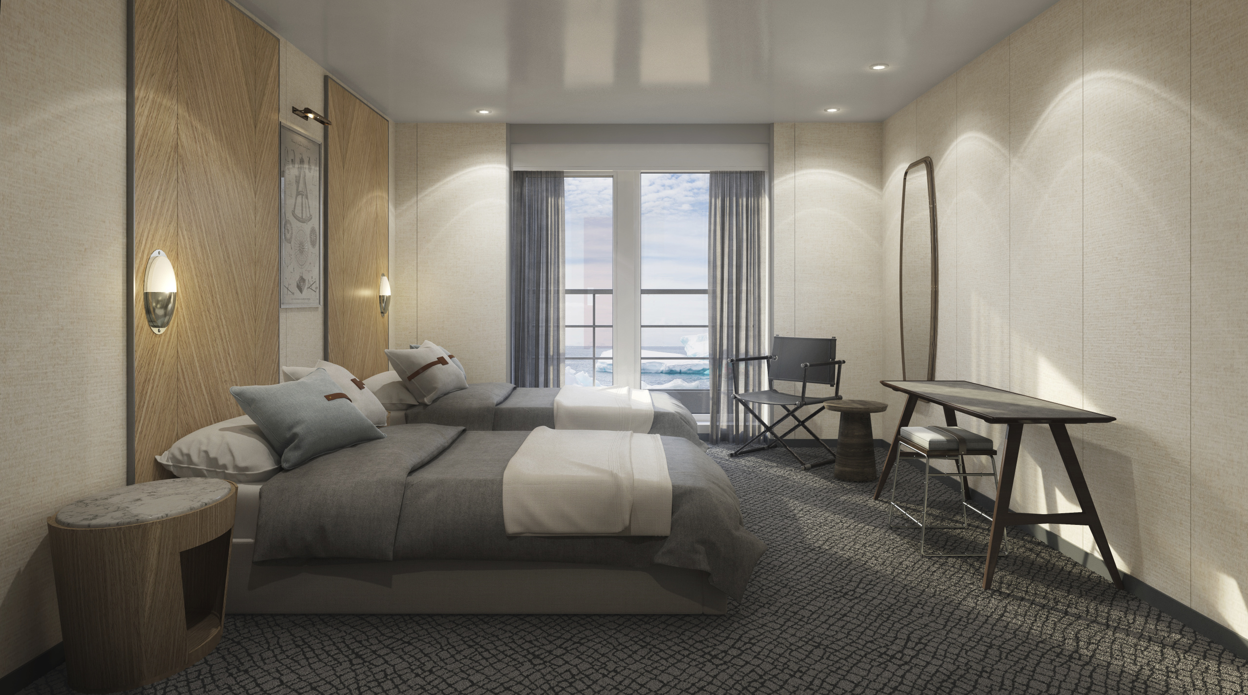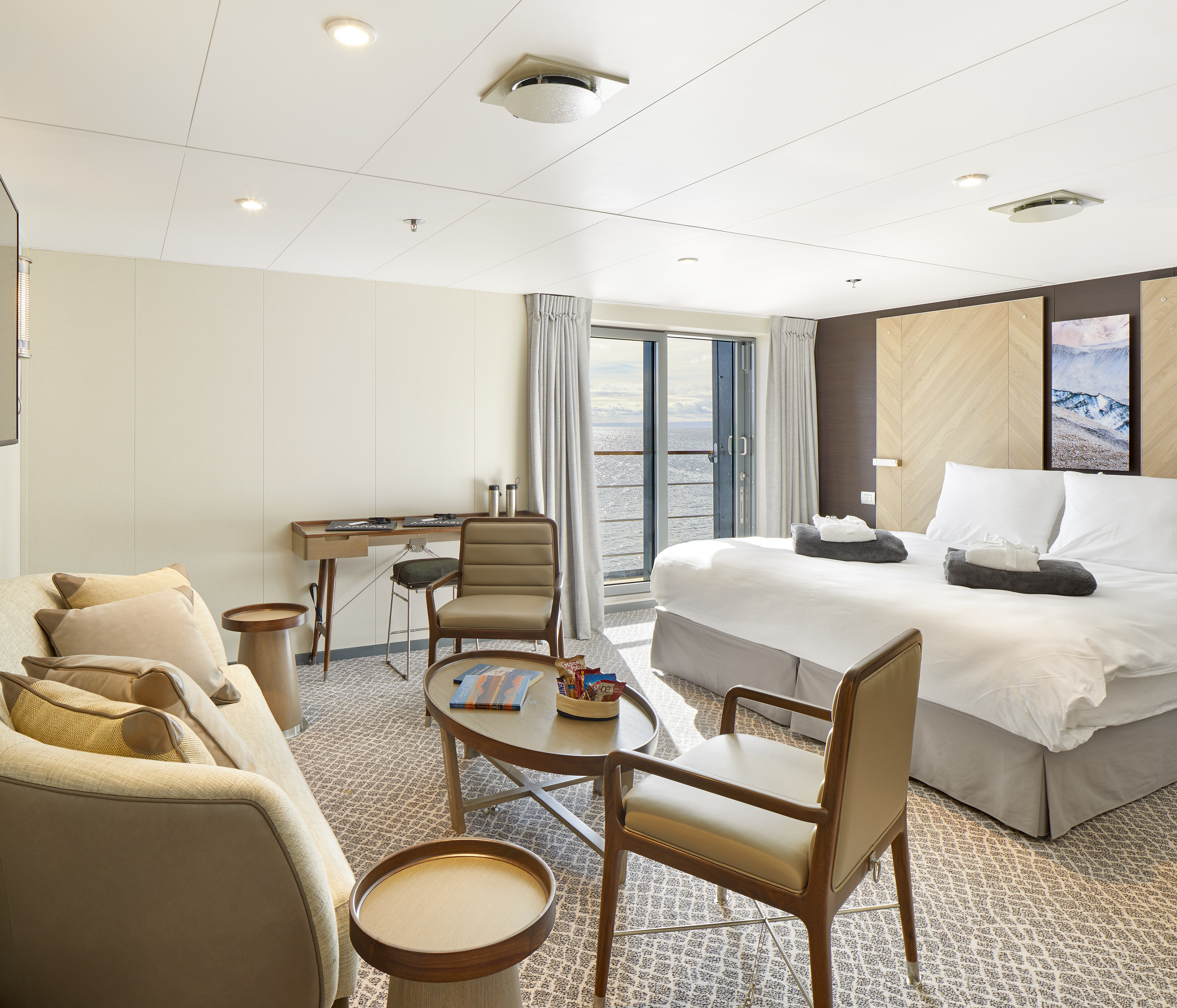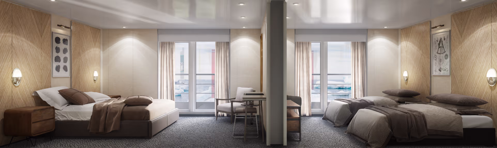 Die Triple Suite ist mit ihren zwei Zimmern perfekt für Familien und Freunde, die gemeinsam auf Entdeckungstour sind und gleichzeitig Raum für sich schätzen: Zwei separate Schlafzimmer, zwei Badezimmer und zwei Balkone bieten Komfort und Privatsphäre für bis zu drei Gäste. Während sich im einen Raum zwei Twin-Betten befinden, verwandelt sich im anderen ein Sofa in ein vollwertiges drittes Bett. Und während draußen das ewige Eis vorbeizieht, wird drinnen gelesen, gelacht oder einfach die gemeinsame Zeit genossen. Ausgestattet mit denselben Annehmlichkeiten wie die Deluxe Veranda Cabins, wird diese Suite schnell zu einem gemütlichen Zuhause auf Zeit.