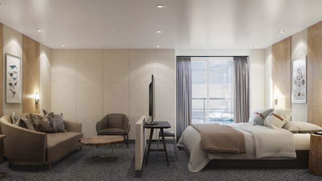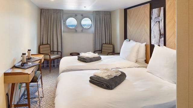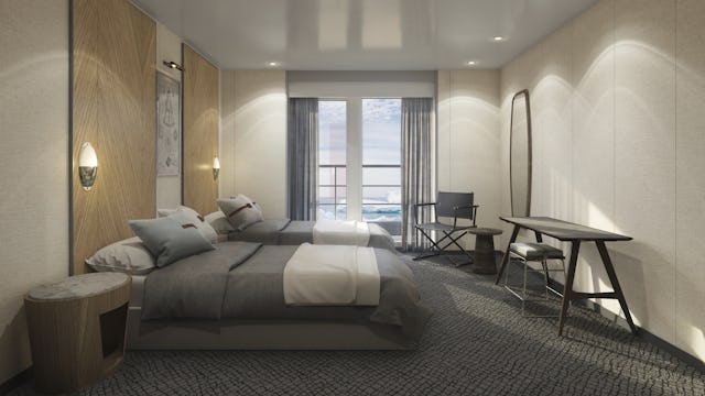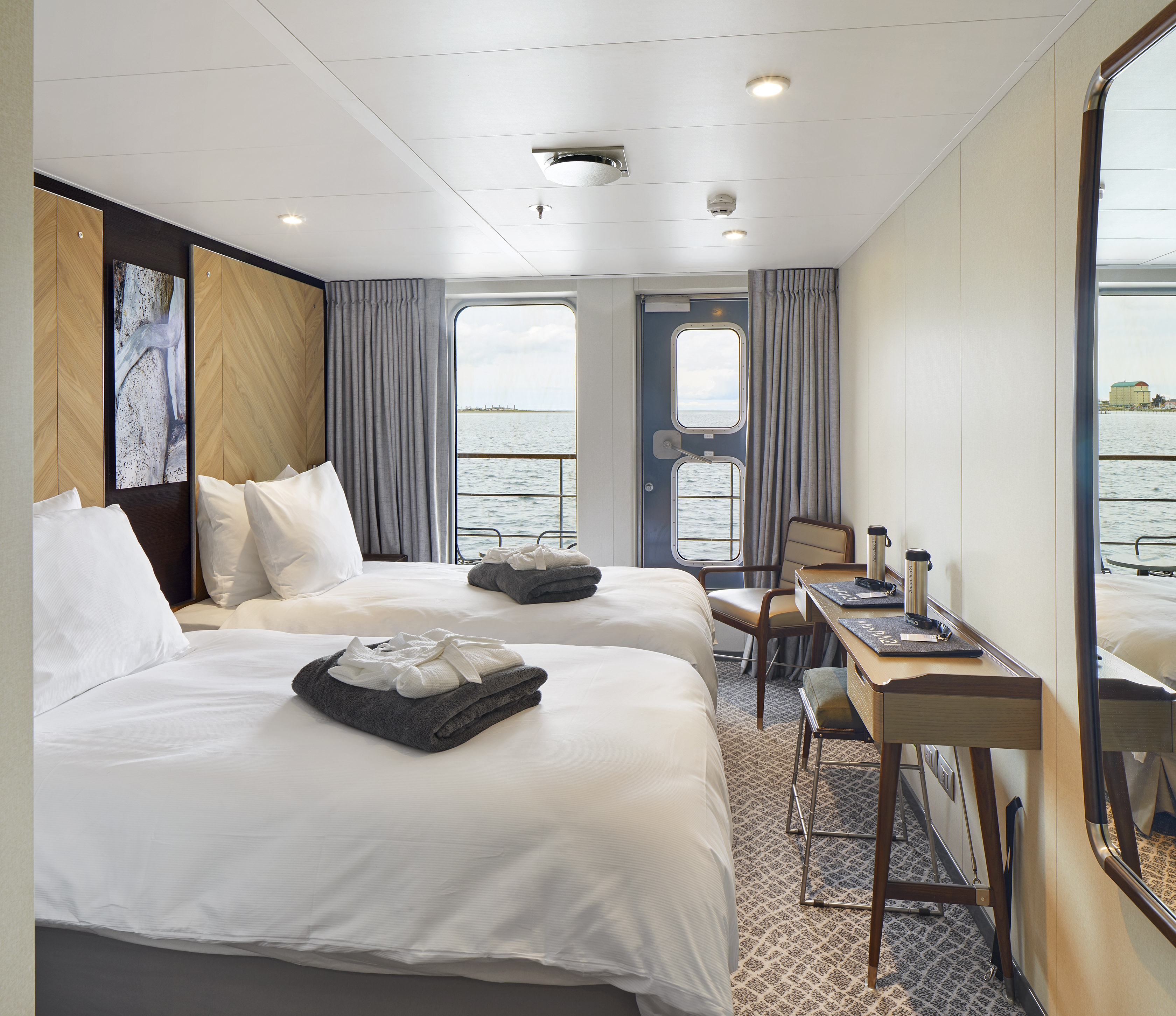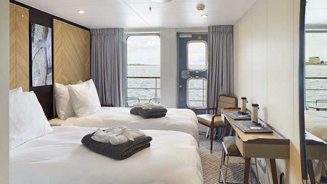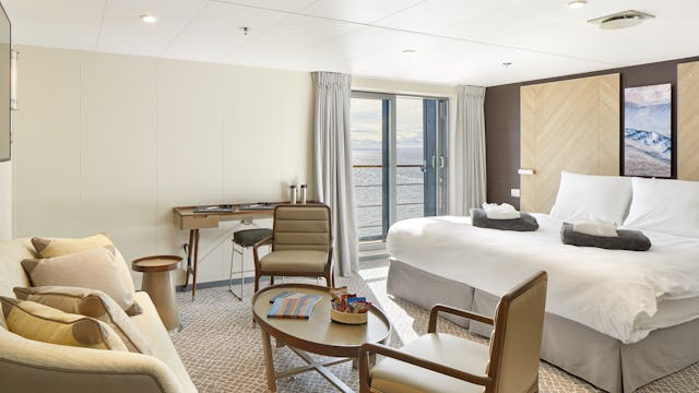 In den Deluxe Veranda Cabins, der häufigsten Kabinenkategorie an Bord, beginnt jeder Tag mit besonders viel Licht. Eine bodentiefe Glasfront mit Schiebetür öffnet den Blick auf endlose Horizonte – vom Bett, vom Sessel, beim ersten Kaffee des Tages. Diese Kategorie ist mit 22 m² großzügig geschnitten, liebevoll ausgestattet und wahlweise mit Queensize-Bett buchbar (anstelle zweier Einzelbetten oder eines Kingsize-Bettes). Täglich frisch aufgefüllte Snacks, eine gut bestückte Minibar, Premium-Badprodukte und eine eigene Kaffee- und Teestation verwandeln die Kabine zu einem privaten Wohlfühlort für alle, die gerne nach draußen schauen und sich dabei rundum umsorgt fühlen möchten.