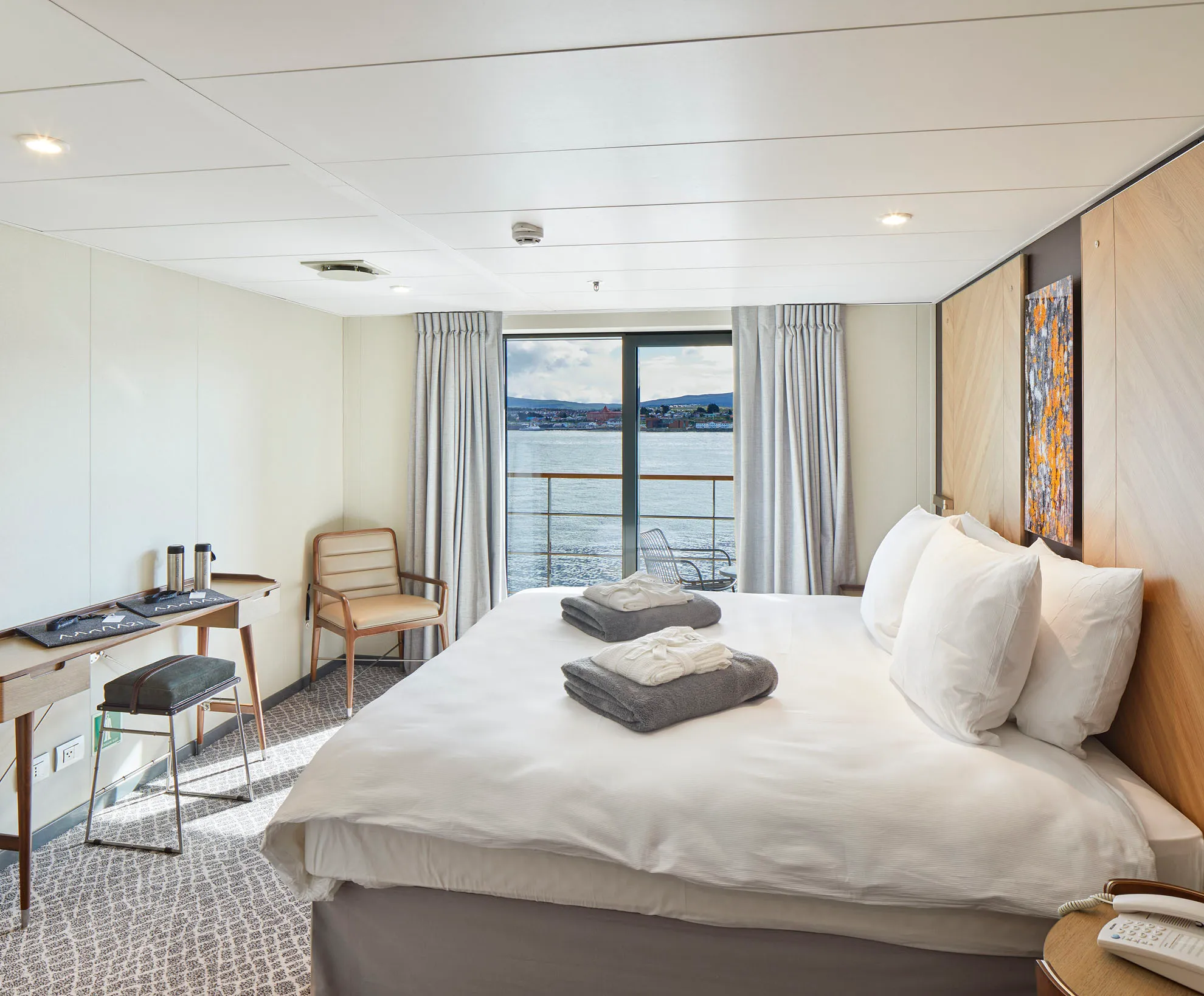 Wenn am Morgen der erste Blick durch das Panoramafenster auf die Weite der Antarktis fällt und frische Luft durch die geöffnete Tür Ihres privaten Balkons strömt, dann wohnen Sie in einer Veranda Cabin. Mit 19 m² bieten diese Kabinen auf Deck 3 viel Tageslicht, stilvolle Gemütlichkeit und das gewisse Extra an Ausblick. Für Alleinreisende gibt es die passende Variante als Einzelkabine auf der Magellan Explorer (Single Veranda Cabin), mit genauso viel Atmosphäre. Hier haben Sie genug Raum, um sich zurückzuziehen, den Moment auszukosten und immer wieder hinauszublicken auf eine Welt, die so still wie spektakulär ist.