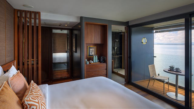 Die Balcony Suite bietet auf rund 30 m² plus einem privaten Balkon von ca. 4–6 m² ein luxuriöses Raumgefühl, das auf Flusskreuzfahrten seinesgleichen sucht. Ein großzügiger Wohnbereich mit Panoramafenstern verbindet Innen- und Außenraum und lässt Licht und Landschaft in die Suite fließen. Das King-Size-Bett oder auf Wunsch Twin-Konfiguration ermöglicht höchsten Schlafkomfort, während das stilvolle Bad mit begehbarer Regendusche und hochwertigen Pflegeartikeln Entspannung garantiert. Der private Balkon lädt zu ruhigen Momenten ein – ideal, um die vorbeiziehende Mekong-Szenerie bei Kaffee oder einem Sundowner zu genießen. Gäste dieser Suite profitieren zudem von personalisierten Serviceleistungen und einem harmonisch abgestimmten Interieur, das Ruhe, Luxus und Natürlichkeit verbindet.
