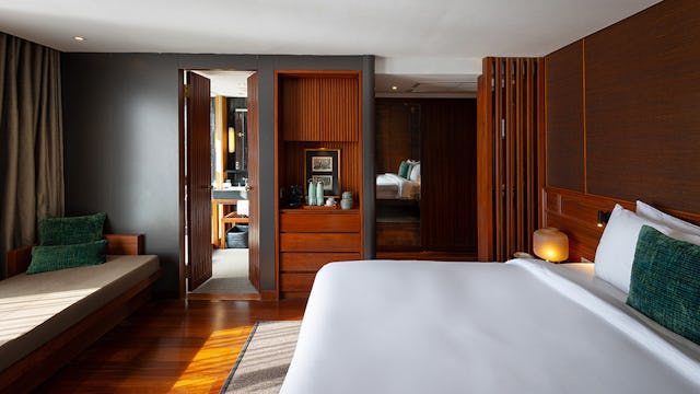 Die Non-Balcony Suite überzeugt mit denselben 30 m² großzügigem Raum wie die Balkonkategorie, bietet jedoch statt eines Balkons ein raumhohes Panoramafenster mit direktem Blick auf den Mekong. Der offene Wohn- und Schlafbereich ist elegant gestaltet und kombiniert warmes Holz, edle Stoffe und asiatische Designelemente zu einem stilvollen Rückzugsort. Das Badezimmer beeindruckt mit begehbarer Dusche, hochwertigen Amenities und moderner Ausstattung. Die Suite bietet durch ihre bodentiefen Fenster ein intensives Naturerlebnis und eignet sich ideal für Gäste, die maximale Innenraumfläche schätzen. Der hohe Komfort, persönliche Serviceleistungen und das ausgewogene Raumkonzept machen diese Kategorie zu einer besonders eleganten Option.