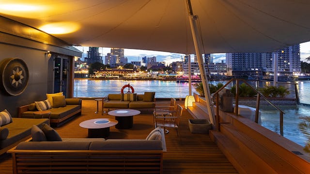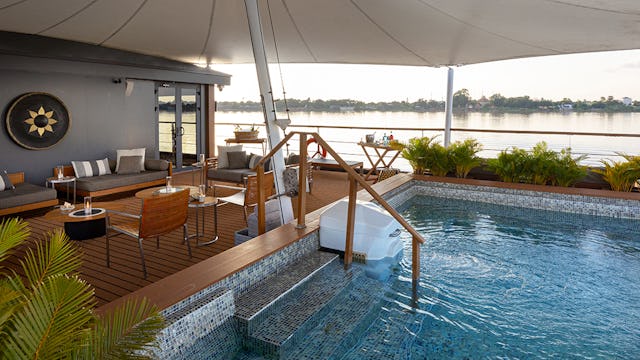 Die Aqua Mekong erstreckt sich über mehrere stilvoll gestaltete Decks, die großzügige Aufenthaltsräume und elegante Rückzugsorte bieten. Herzstück des Lebens an Bord ist das weite Sonnendeck mit seinem ikonischen Infinity-Pool, der sich wie eine Wasserterrasse über den Fluss legt. Von hier aus genießen Gäste ungestörte Ausblicke auf die Uferlandschaften und die sanfte Bewegung des Mekong. Bequeme Lounges, schattige Ruhebereiche und private Sitzinseln schaffen eine Atmosphäre, in der Entspannung und Staunen Hand in Hand gehen. Das Observation Deck lädt zu Momenten der Stille ein – perfekt für Sonnenaufgänge oder die meditative Fahrt durch tropische Landschaften. Weiter unten befinden sich Fitnessbereiche, Spa-Räume und offene Loungebereiche, die den Aufenthalt komfortabel und abwechslungsreich gestalten. Die Verbindung von modernem Design mit asiatischen Details zieht sich durch alle Ebenen. Großzügige Panoramafenster verstärken das Gefühl, ständig in Kontakt mit der Natur zu sein. Die Decks der Aqua Mekong schaffen so ein harmonisches Gleichgewicht aus Erlebnis, Flexibilität und luxuriöser Entspannung.