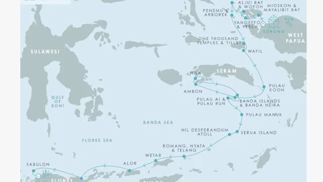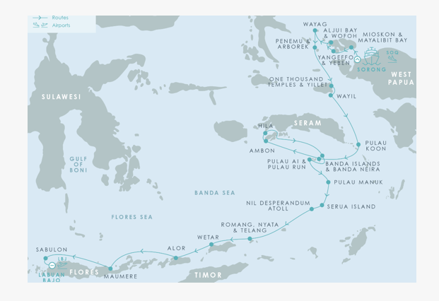 Diese Fahrt führt uns von Sorong bis nach Flores und vereint das Beste unserer Reiserouten für Raja Ampat, West Papua und Forgotten Island. In einer einzigen Expedition erleben Sie das kulturelle Geflecht der Banda-Inseln – einst das Herz des Gewürzhandels – und die überirdischen Landschaften von Raja Ampat, bekannt für seine unberührten Tauchplätze. Erleben Sie Wanderungen durch unerforschte Landschaften der mythischen Vergessenen Inseln – einer abgelegenen Inselkette, die selten von Kreuzfahrten in Ostindonesien erkundet wird.