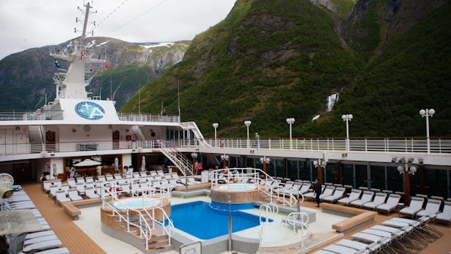 Das großzügige Pooldeck auf Deck 9 lädt mit einem erfrischenden Pool und zwei Whirlpools zum Verweilen ein – umgeben von bequemen Liegen und einer Pool Bar, an dem Sie erfrischende Cocktails und leichte Snacks genießen. Wenn die Sonne dem Horizont entgegenwandert lädt die Sunset Veranda & Sunset Bar als offener Lounge‑Bereich zum Genießen kühler Drinks bei spektakulären Sonnenuntergängen ein.