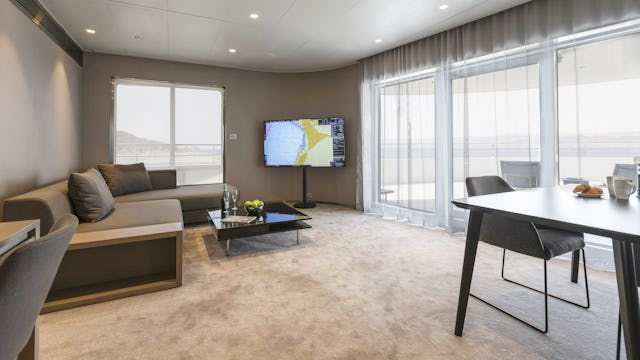 Mit rund 60 m² bieten die zwei exklusiven Terrace Suiten im hinteren Teil des Panorama Decks ein außergewöhnliches Raumangebot. Genießen Sie die Sonne auf Ihrer übergroßen, nach achtern gerichteten Terrasse, ausgestattet mit einem Ecksofa, zwei Liegestühlen und einem Esstisch für zwei Personen. Der Balkon ist umlaufend, sodass die Suite lichtdurchflutet und besonders großzügig wirkt. Mit Annehmlichkeiten wie einem Kissenmenü, einer Illy-Espressomaschine und einem Sekt- und Obstteller bei Ankunft wird Ihr Aufenthalt zu einem luxuriösen Erlebnis. Darüber hinaus haben Sie die Möglichkeit, bis zu zwei Kleidungsstücke pro Tag waschen zu lassen und sind nur ein Deck vom Infinity-Pool entfernt.