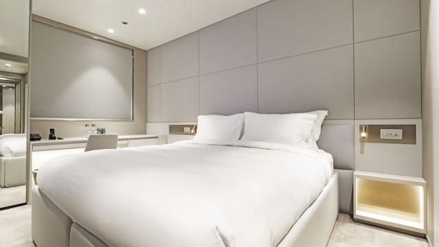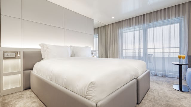 Wenn es noch etwas mehr Platz sein darf, ist eine der zwei Yacht Suiten auf dem Observation Deck die perfekte Wahl. Auf rund 65 m² bieten die beiden Suiten nicht nur ein großzügiges Raumangebot, sondern auch einen spektakulären Blick auf die Küste. Am Heck des Schiffes gelegen, können Sie von Ihrer privaten Terrasse aus eine ungestörte Aussicht und Privatsphäre und sind außerdem vor der Meeresbrise geschützt, während Sie die Weite des Ozeans erleben. Diese geräumige Suite ist perfekt für längere Aufenthalte und bietet Platz für Ihre Habseligkeiten sowie alle Annehmlichkeiten der Suiten, wie etwa eine Flasche Champagner, einen Obstteller und eine Illy-Espressomaschine.