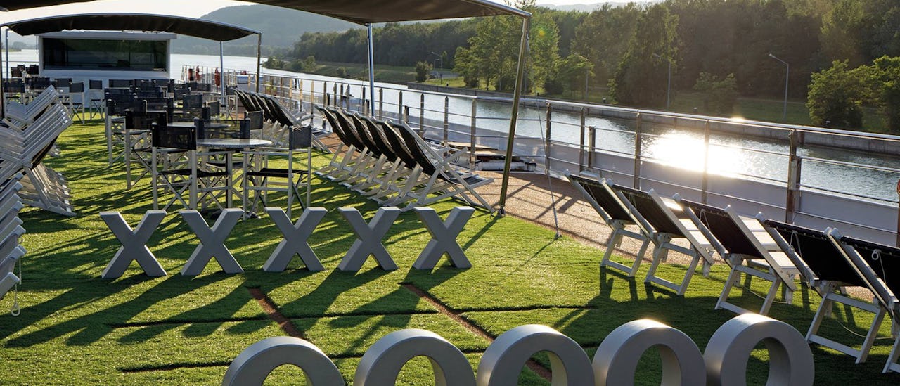 Auf dem Sonnendeck erwarten Sie Deckspiele, ein Rundweg und ein Platz zum Entspannen und Genießen der Aussicht. Oder stoßen Sie mit neuen Freunden an und entspannen Sie sich, während Sie die atemberaubende Natur Europas an sich vorbeiziehen lassen.