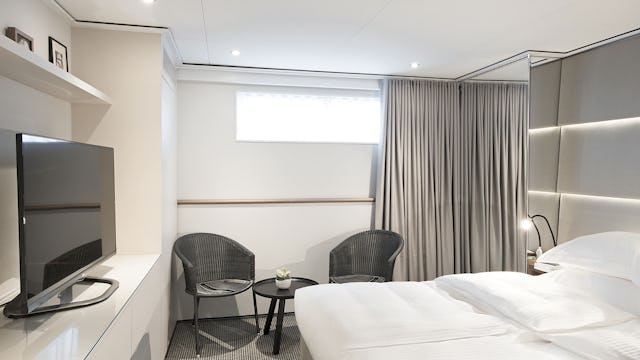 Die Emerald Staterooms auf dem Riviera Deck liefern eine perfekte Mischung aus Raum und Luxus. Jeder der zwei Emerald Single Staterooms ist mit seinen 11 m² ideal für Alleinreisende geeignet und die perfekte Unterkunft für nur eine Person. Die Einzelkabinen der Emerald Star bieten Ihnen eine geschmackvoll eingerichtete Kabine, die auf höchsten Komfort ausgerichtet ist. Die regulären Emerald Staterooms sind mit ihren 15 m² für zwei Personen konzipiert und beeindrucken durch ihre großzügige Raumaufteilung. Das Panoramafenster flutet die Kabine mit natürlichem Licht, und das elegante Bad sorgt für ein zusätzliches Gefühl der Exklusivität.