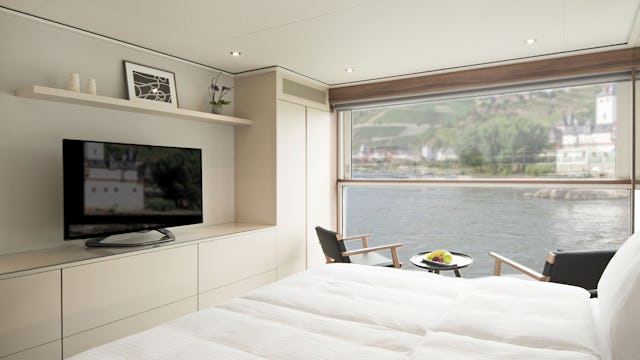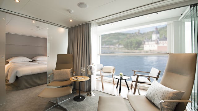Sie wollen auch auf einer Flusskreuzfahrt nicht auf ein exklusives Refugium verzichten? Die Owner’s Suite mit 29 m² bietet Ihnen alles, was Sie für höchsten Komfort und Luxus benötigen. Das separate Schlafzimmer ist abgetrennt vom großzügigen Wohnbereich, der mit einer stilvollen Lounge-Area ausgestattet ist. Ein begehbarer Kleiderschrank sorgt für reichlich Stauraum und rundet das luxuriöse Ambiente ab. Genießen Sie frisch gebrühten Kaffee aus der Nespresso-Maschine und erfrischen Sie sich mit einer täglich nachgefüllten Minibar. Als die exklusivste Suite an Bord verspricht die Owner’s Suite ein außergewöhnliches Erlebnis für anspruchsvolle Reisende.