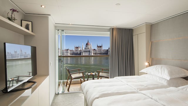 Mit einer großzügigen Fläche von knapp 17 m² präsentieren sich die Emerald Panorama Balcony Suiten als eleganter Rückzugsort, der sowohl auf dem Horizon Deck als auch auf dem Vista Deck zu finden ist. Dank des einzigartigen und innovativen Allwetter-Balkonsystems können Sie das bodentiefe Fenster auf Knopfdruck elektronisch herunterfahren. Ein überdachter Terrassenbereich, ausgestattet mit zwei Stühlen und einem Tisch, lässt Sie die Aussicht auf die vorbeiziehende Umgebung bei jedem Wetter in vollen Zügen erleben – ein perfekter Ort, um den Fluss in all seiner Pracht zu genießen.
