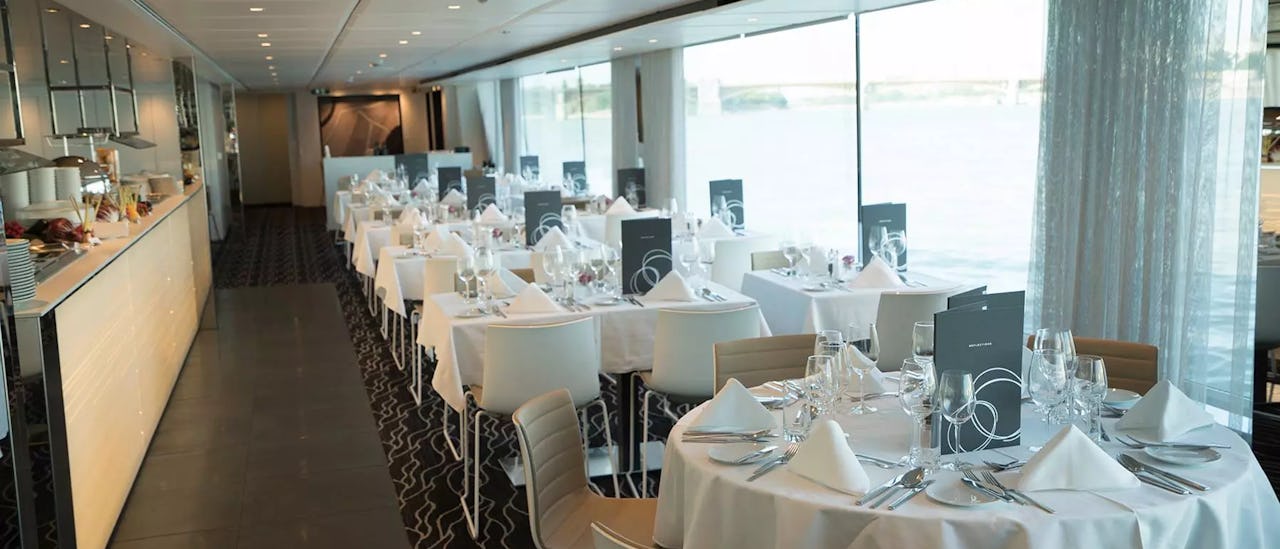Das Reflections Restaurant auf dem Vista Deck ist das kulinarische Herzstück des Schiffs. Hier erwartet Sie ein reichhaltiges Frühstück, ein delikates Mittagsbuffet und abends ein exquisites 4-Gänge À-la-carte-Menü. Für entspannte Momente sorgt die Horizon Lounge, wo Sie ein Selbstbedienungs-Frühstück oder ein leichtes Mittagessen in einer gemütlichen Atmosphäre genießen können. Und nicht zu vergessen: der Afternoon Tea mit frischem Gebäck nach einem ereignisreichen Sightseeing-Tag. Zu späterer Stunde wird die Lounge mit einer gut bestückten Bar und Tanzfläche zum idealen Spot, um den Tag ausklingen zu lassen. Bei schönem Wetter können Sie zudem auf der Terrasse, einem überdachten Open-Air-Bereich an der Vorderseite des Schiffes, dinieren und dabei den atemberaubenden Ausblick genießen.