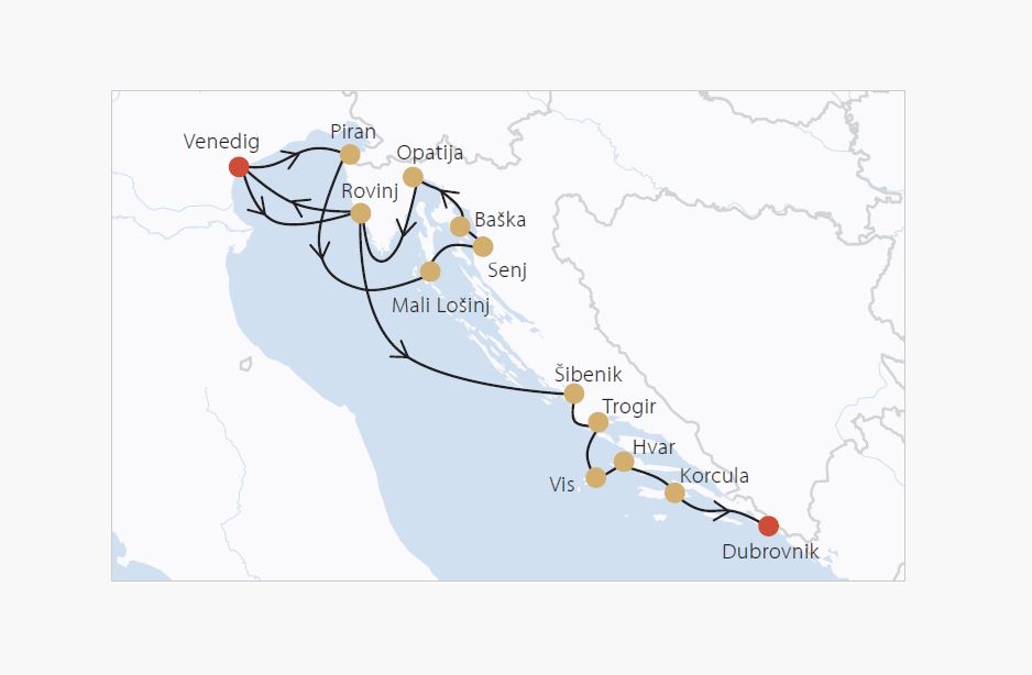 Die Stopps auf der Route sind so atemberaubend wie malerisch: Zauberhafte Küstenstädte und Inseln in Italien und Kroatien führen Sie in die faszinierende Vergangenheit und lassen Sie doch ganz im Hier und Jetzt ankommen. Von den Brücken Venedigs bis zur Stadtmauer Dubrovniks erwarten Sie die schönsten Perlen des Mittelmeers.