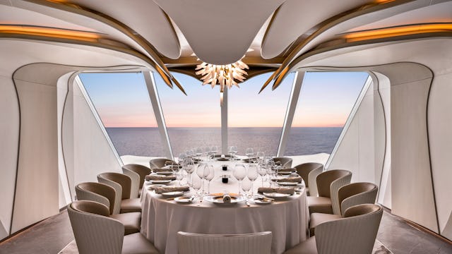 Die Vista-Suiten bieten auf 161 bis 171 m² noch mehr Platz und Exklusivität: Mit einer umlaufenden Veranda, einem Meerblick-Bad und einem stilvollen Wohnbereich mit Sitz- und Essbereich wird der Aufenthalt zu einer wahren Oase der Entspannung. Sie sind in subtile Farbtöne gehüllt, die mit dem Meer und dem Himmel verschmelzen, und mit leuchtendem Marmor, Granit und Eichenholz ausgestattet. Das luftige Wohnzimmer wird mit einem Esszimmer und einem Barbereich ergänzt, die einen herrlichen Ausblick bieten und sich zur großen Teakholzveranda öffnen. Die extravagante Suite verfügt über einen geräumigen Kleiderschrank und einen Ankleidebereich, der an das übergroße, lichtdurchflutete Master-Bad mit Porzellanwanne angrenzt.