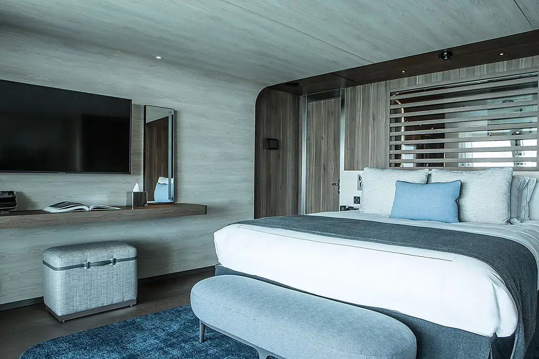 Die Owner’s Suite auf Deck 8 ist die exklusivste Unterkunft an Bord der Le Commandant Charcot und wurde für Gäste geschaffen, die das Außergewöhnliche suchen. Auf 115 m² Wohnfläche und einer umlaufenden privaten Terrasse von 186 m² entfaltet sich ein unvergleichlicher Komfort. Die weitläufige Terrasse begeistert mit einer eleganten Outdoor-Lounge aus Liegestühlen, Sitzecke, Esstisch und eigenem Jacuzzi – ein perfekter Rückzugsort unter freiem Himmel. Während Panoramafenster, zwei verglaste Schiebetüren und ein Outdoor-Teleskop von Swarovski Optik atemberaubende Ausblicke eröffnen, sorgen im Inneren ein Wohnbereich mit Sesseln, Schlafsofas, Elektrokamin und Schreibtisch, sowie ein Essbereich für sechs Personen für eine luxuriöse Atmosphäre. Eine Wellness-Badewanne mit Meerblick und eine inkludierte Spa-Behandlung für zwei Personen machen den Aufenthalt perfekt.
