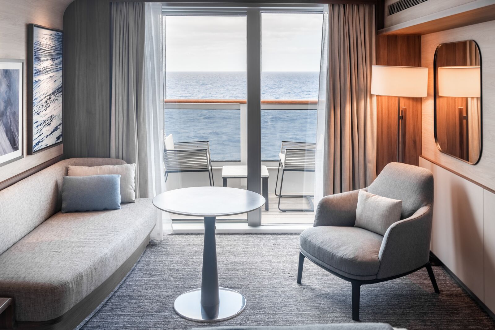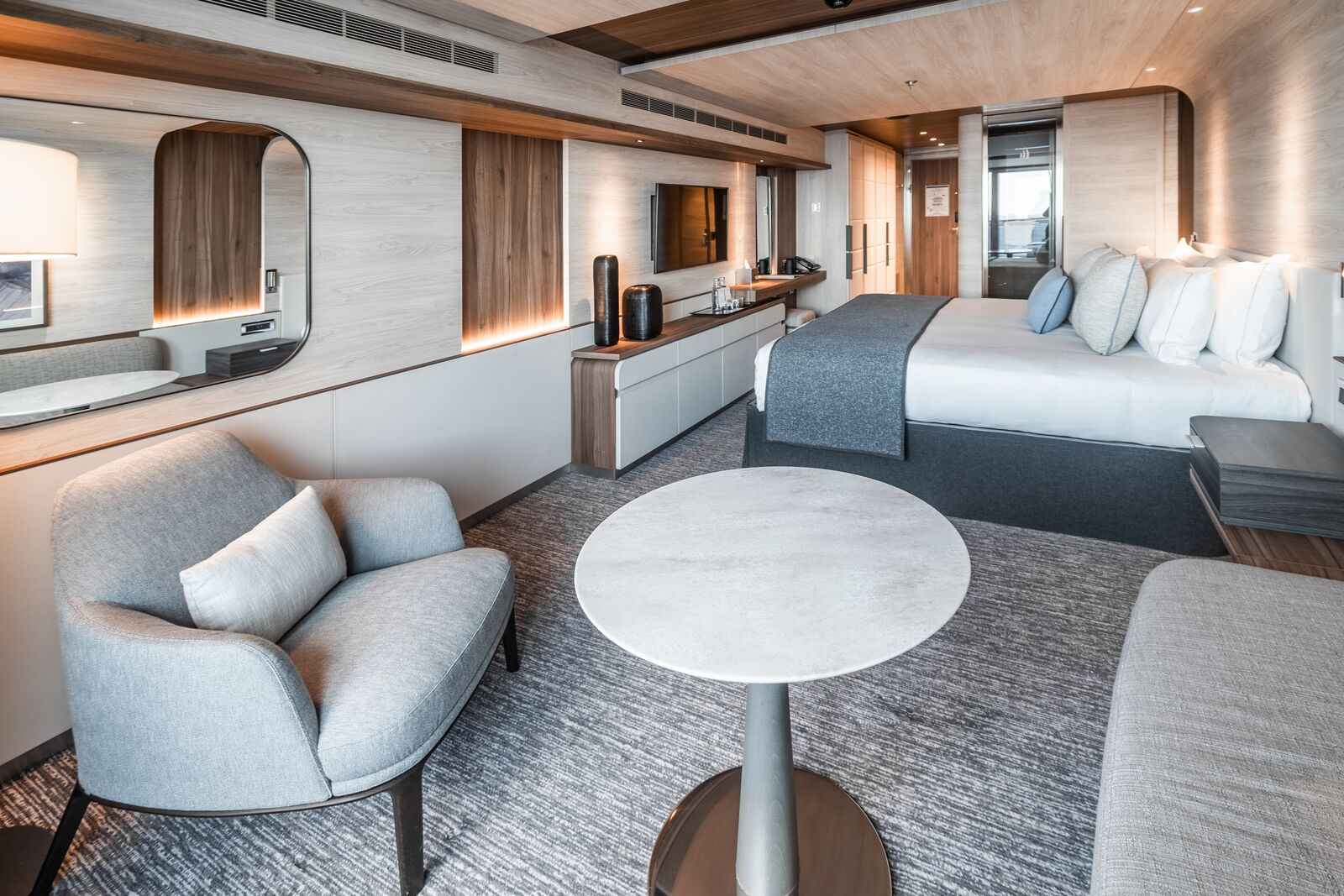 Die Privilege Suite vereint großzügige Dimensionen mit dem unverwechselbaren Stil der Le Commandant Charcot. Auf 48 m² genießen Sie ein elegantes Wohnambiente mit klar getrenntem Schlaf- und Wohnbereich, die durch eine Schiebetür verbunden sind. Ein großes Panoramafenster und eine verglaste Schiebetür öffnen den Blick auf die majestätischen Landschaften, während der 12,5 m² große Balkon Raum für ungestörte Momente im Freien schafft. Hochwertige Details und eine behagliche Atmosphäre machen die Suite zu einem Rückzugsort, der Komfort und Entdeckergeist auf höchstem Niveau verbindet.