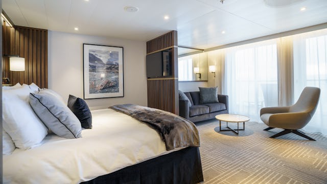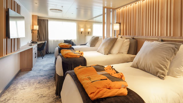 Die Explorer Suiten und Explorer Triple Kabinen sind jeweils 26,5 m² groß und damit die ideale Meerblickkabine der Ultramarine. Beide Varianten verfügen über ein Panoramafenster und einen kleinen Sitzbereich mit zwei Stühlen für entspannte Momente mit Aussicht. Während die Explorer Suite mit einem Doppel- oder zwei Einzelbetten ausgestattet ist und sich auch für Menschen mit eingeschränkter Mobilität eignet, verfügt die Explorer Triple Suite über drei Einzelbetten, von denen sich zwei zu einem Doppelbett zusammenstellen lassen. Das macht diese Suite ideal für Gruppen von drei Personen oder Alleinreisende, die sich eine Suite mit Reisenden desselben Geschlechts teilen möchten.