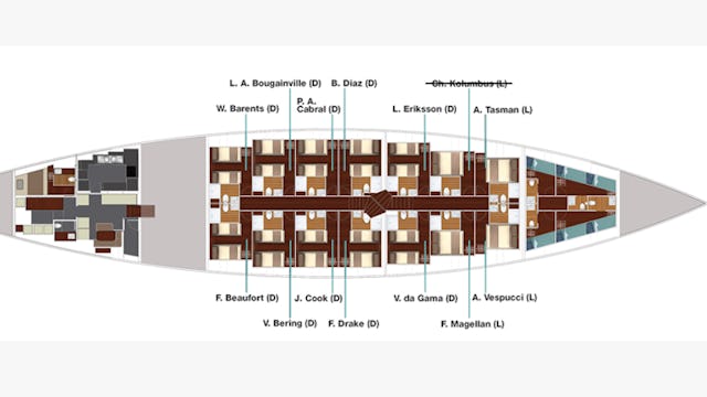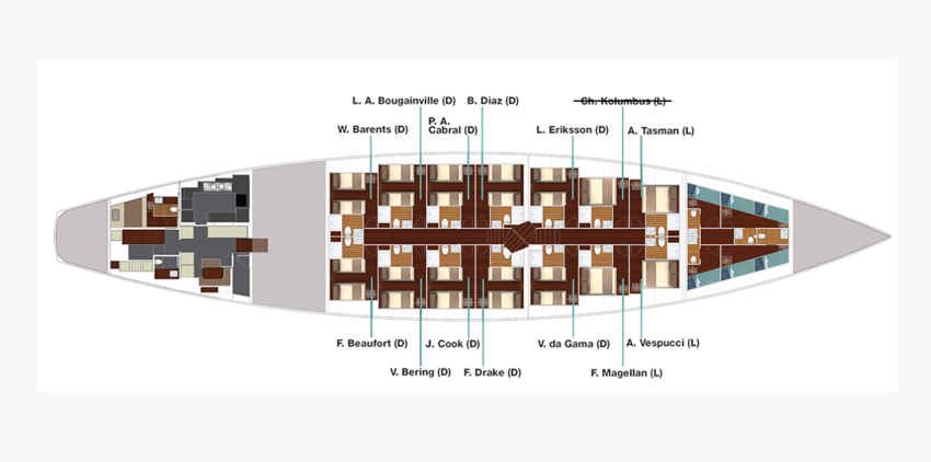 Unter Deck erwarten Sie 13 klimatisierte Doppelkabinen – alle mit eigenem Bad. Zehn Deluxe-Kabinen (ca. 12–13 m²) verfügen über Einzel- oder Doppelbetten, drei Long-Kabinen (ca. 11 m²) über ein Doppelbett (2,10 × 1,60 m). In den Deluxe-Kabinen können die Betten flexibel als Einzel-, Doppel- oder Familienbett arrangiert werden. Jede Kabine ist mit Kleiderschrank, Haartrockner, Hand- und Badetüchern, individuell regulierbarer Klimaanlage, 230-Volt-Steckdosen, Rettungswesten und Feuerlöschern ausgestattet – komfortabel, stilvoll und funktional zugleich.