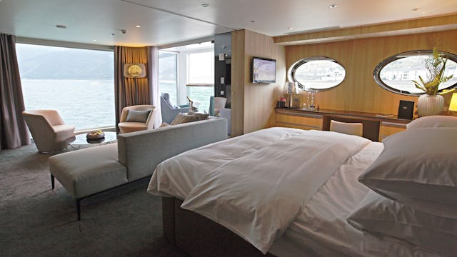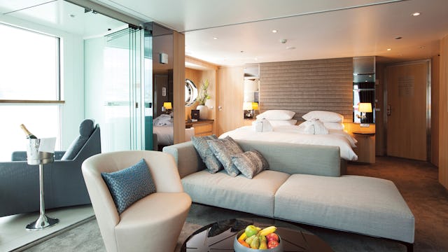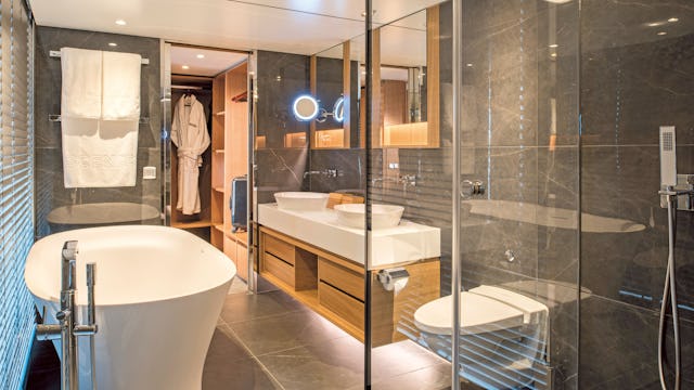 Als Gast in einer der Royal Suiten steht Ihnen der meiste Raum zum privaten Rückzug zur Verfügung. Die 27 qm bis 48 qm umfassen neben einer separaten Lounge überdimensional große Badezimmer mit separater Dusche und Badewanne. Während Sie Ihren Begrüßungschampagner genießen, lohnt es sich in dieser gehobenen Kabinenkategorie ganz besonders, sich mit dem Wellnessprogramm der Scenic Jewel vertraut zu machen, schließlich wird Ihnen 200 € an Bordguthaben zum Einlösen im Wellnesscenter gewährt.