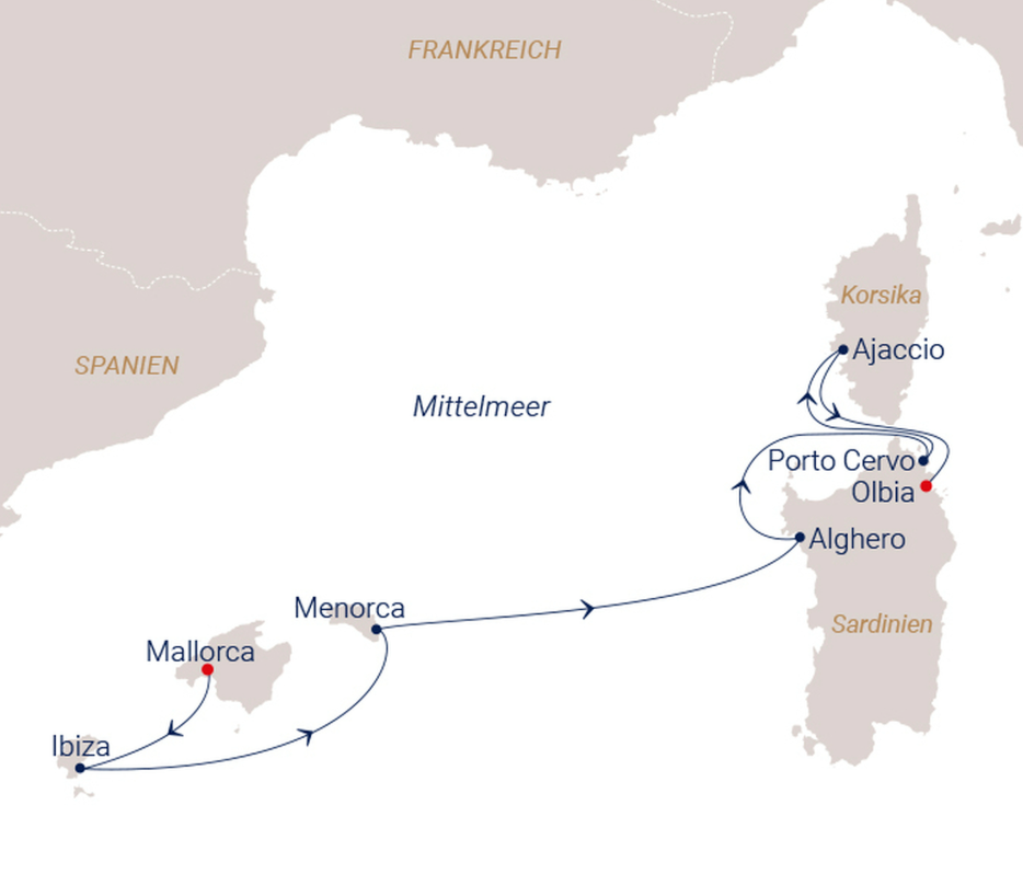 Drei hochkarätige Live-Acts sorgen für mitreißende Stimmung und machen diese Reise zu einem besonderen musikalischen Erlebnis – mit Max Giesinger als einem der Highlights. An Bord der Sea Cloud Spirit wird das Schiff selbst zur Bühne für erstklassige Musik, die unplugged, authentisch und ganz nah erlebbar ist. Laue Sommernächte laden dazu ein, in das pulsierende Abend- und Nachtleben dreier angesagter Hotspots im Mittelmeer einzutauchen. Die Baleareninsel Menorca fasziniert mit ihrer natürlichen, unaufgeregten Schönheit und der charmanten Hauptstadt Mahón. Abgerundet wird die Reise durch die Costa Smeralda mit Porto Cervo, dem exklusiven Yachthafen an Sardiniens legendärer Smaragdküste.