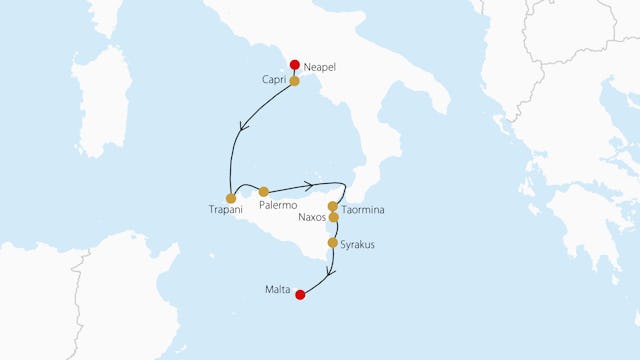 Segel setzen Richtung Sonne, so lautet das Motto dieser Reise, bei der Sie Capri, Sizilien und Malta ansteuern. Bildschöne Grotten, historische Kellereien und multikulturelle Pracht aus verschiedenen Jahrhunderten prägen das Bild, während sich Panoramen von weitem Meer, atemberaubenden Küsten und imposanten Felsen um Sie herum erstrecken.