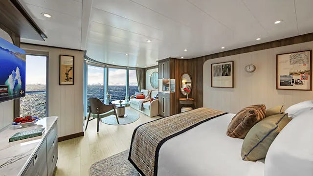 Weitläufig und lichtdurchflutet empfängt Sie die Panorama Suite auf großzügigen 39 m². Der grenzenlose Wohnbereich öffnet sich zu einer privaten Veranda, die atemberaubende Ausblicke auf das Meer bietet und der perfekte Ort ist, um den Horizont zu genießen. Dank der raumhohen Fenster wachen Sie jeden Morgen mit einem faszinierenden Panorama auf, das Sie direkt in die Schönheit der Umgebung eintauchen lässt. Beheizte Fliesen und eine Badewanne mit Meerblick verwandeln das Bad in Ihre persönliche Wohlfühloase. Diese in der Mitte des Schiffs gelegene Meerblickkabine der Seabourn Pursuit ist eine exklusive Einladung zum Genießen.