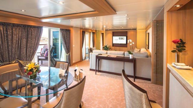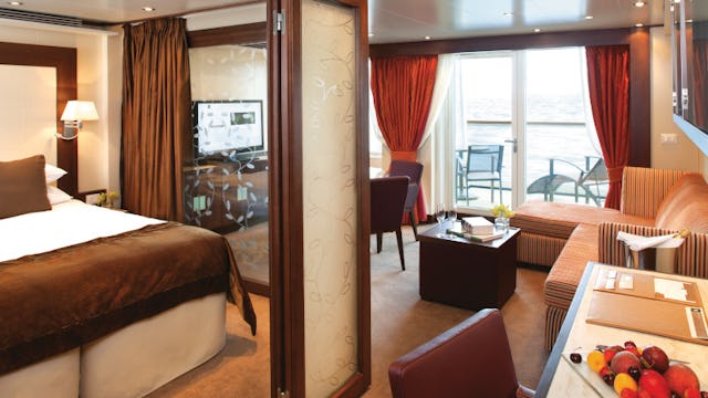 Wenn Sie sich ein hochwertigeres Refugium wünschen, ist die Owner’s Suite mit ihren 50 m² Ihr persönliches Paradies auf See. Direkt am Bug gelegen, offenbart sie Ihnen einen atemberaubenden Blick, der Sie jeden Tag aufs Neue verzaubert. Während der elegante Wohnbereich mit Schreibtisch, Kaffeemaschine und privatem Essbereich Raum für genussvolle Momente und entspanntes Beisammensein schafft, können Sie sich auf der geschwungenen Veranda mit Sonnenliegen und Essbereich der Meeresbrise hingeben und den Alltag weit hinter sich lassen. Das separate Schlafzimmer lädt indes mit einem großen Queensize-Bett und eigenem High-Definition-TV dazu ein, ganz in Ruhe neue Kraft zu tanken. In dieser luxuriösen Balkonkabine der Seabourn Pursuit erleben Sie Gemütlichkeit, die berührt und begeistert.