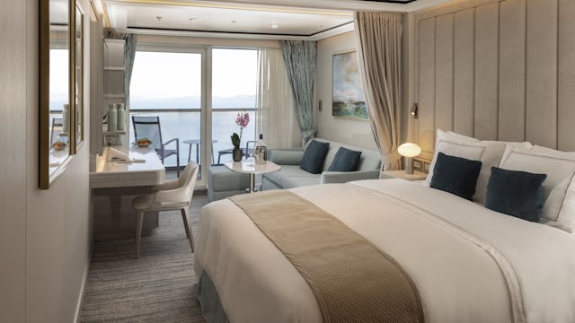 Wenn Sie sich nach noch mehr Raum, Privatsphäre und spektakulären Aussichten sehnen, sind die Silver, Signature oder Master Suiten wie für Sie gemacht. Alle drei bieten Ihnen ein elegantes Badezimmer mit Whirlpool-Badewanne, einen stilvollen Wohnbereich mit Sofa und Sesseln sowie einen Esstisch für zwei bis vier Personen. Die Silver Suite ist ein beliebter Klassiker mit 63 m² Wohnfläche (inkl. 11 m² Veranda) und Meerblick sowohl aus dem Wohnbereich als auch dem Schlafzimmer. Die neue Signature Suite bietet Ihnen mit 65 m² (inkl. 16 m² Veranda) noch mehr Raum und freie Ausblicke. Die ebenfalls neue Master Suite geht mit ihrer Ecklage im Achterbereich noch einen Schritt weiter. Bis zu 77 m² Innenraum, bis zu 31 m² Veranda und ein traumhafter 270-Grad-Blick auf jedes Reiseziel sorgen dafür, dass Sie sich rundum wohlfühlen.