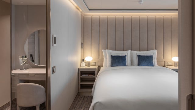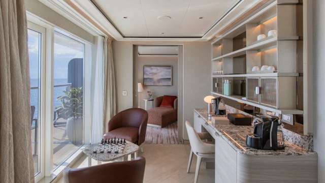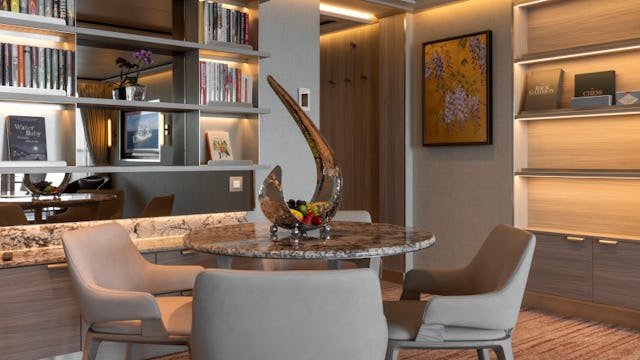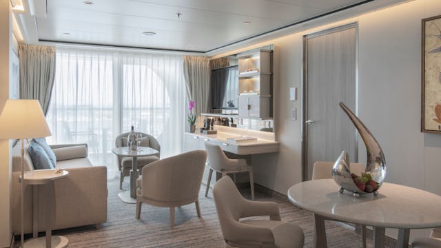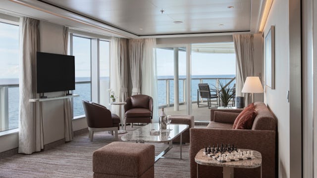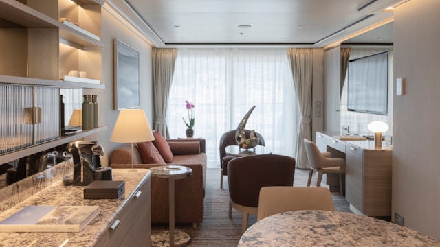 Wenn Sie noch höhere Ansprüche haben, erwartet Sie in der Owner’s Suite ein Lebensgefühl der Extraklasse. Elegant, großzügig und bis ins Detail durchdacht, erinnert sie an ein stilvolles Penthouse auf See. Auf 98 Quadratmetern – oder beeindruckenden 131 Quadratmetern in Kombination mit einer Premium Veranda Suite – erleben Sie Raum, Ruhe und zeitlose Eleganz. Genießen Sie Ihre Mahlzeiten am Esstisch für sechs Personen, entspannen Sie auf der großzügigen Veranda und lassen Sie sich vom herrlichen Ausblick aus Wohn- und Schlafzimmer begeistern. Mit ihrer zentralen Lage und ihrem klassischen Stil ist die Owner’s Suite ein echtes Prestige-Erlebnis.