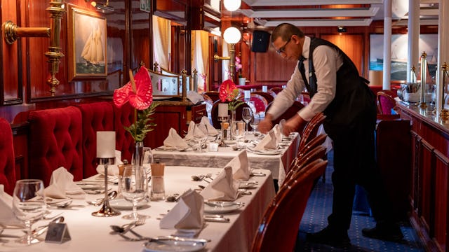 Das Restaurant der Royal Clipper beeindruckt nicht nur durch seine großzügigen Innenräume, sondern auch durch sein einzigartiges dreistöckiges Atrium, das das Sonnenlicht in den eleganten Speisesaal strömen lässt. In einer entspannten Atmosphäre genießen Sie ganz ohne feste Sitzordnung Köstlichkeiten aus der internationalen Küche. Als einziges Restaurant an Bord der Royal Clipper bietet es Platz für alle Gäste, sodass es auch nur eine Essenssitzung pro Tag gibt. Sie haben zudem die Wahl zwischen verschiedenen Sitzmöglichkeiten – von gemütlichen Sitzecken bis hin zu großen Gruppentischen, um das Erlebnis gemeinsam mit Freunden zu genießen.