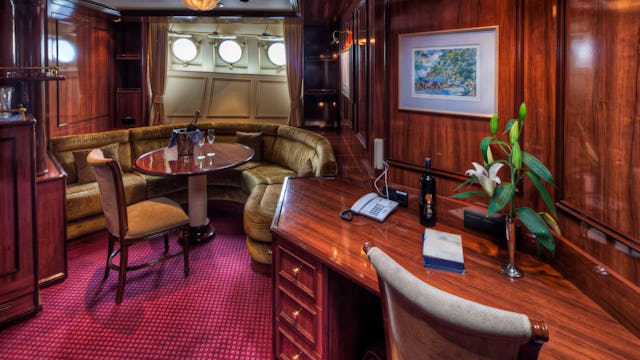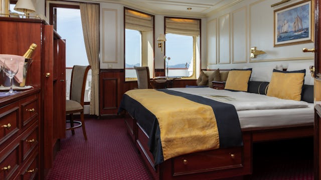 Die Deluxe Suiten der Royal Clipper bieten auf dem Hauptdeck exquisiten Luxus und Komfort. Die Kombination aus heller und dunkler Wandvertäfelung macht die Suite zu einem äußerst stilvollen Erholungsort. Auf 26 m², inklusive eigenem Balkon und 24-Stunden-Zimmerservice, genießen Sie eine großzügige Suite, in der sich zwei Einzelbetten zu einem Doppelbett verschieben lassen. Diese Deluxe Suiten sind gleichzeitig die einzigen Balkonkabinen der Royal Clipper. Der Wohnbereich mit bequemem Sofa und Sessel, eine Minibar und das luxuriöse Marmorbad sorgen für Entspannung pur. Große Fenster fluten die Suite mit Licht, während die kleine Sitzecke am Fenster einen atemberaubenden Ausblick ermöglicht.
