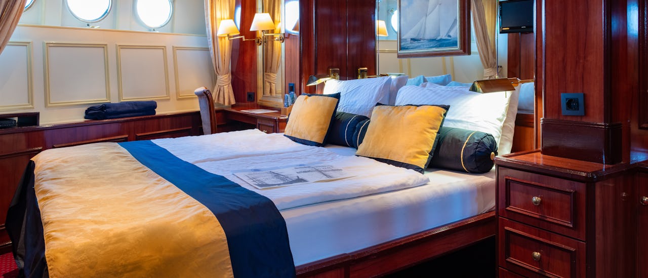 Auf Ihrem luxuriösen Segeltörn stehen 114 stilvolle Kabinen zur Auswahl, die mit ihrer dunklen Holzvertäfelung, marineblauen Teppichen und stilvollen Schiffsmotiven auf bis zu 20 m² eine ganz besondere Atmosphäre schaffen. Mit Ausnahme der sechs Royal Clipper Innenkabinen genießen Sie stets den Blick aufs Meer – sei es in einer der 90 Außenkabinen, den 14 Deluxe-Kabinen, den 2 Deckkabinen oder den 2 exklusiven Eignersuiten. Zur Ausstattung Ihrer Kabine gehören ein bequemes Doppelbett (auf Wunsch teilbar), ein Marmorbad mit Dusche oder Badewanne, ein Schreibtisch, ein Flachbildfernseher und ein Kabinensteward für Ihre Wünsche. Wie im feinsten Luxushotel verfügen Sie über alle Annehmlichkeiten, die Sie brauchen.