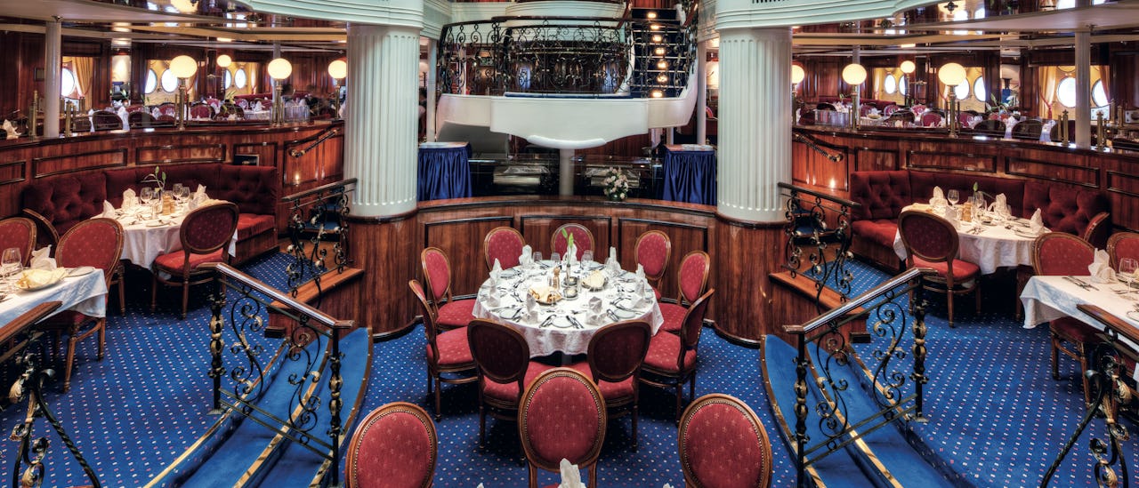Das imposante äußere Erscheinungsbild der Royal Clipper setzt sich in den für ein Segelschiff ungewöhnlich großzügigen Innenräumen konsequent fort. Ihr Herzstück bildet ein dreistöckiges Atrium, durch das Sonnenlicht in das elegant eingerichtete Restaurant fällt. Hier genießen Sie in zwangloser Atmosphäre – ohne feste Sitzordnung und Krawattenpflicht – die kulinarischen Köstlichkeiten, die von den Köchen aus aller Welt kreiert werden. Das Restaurant bietet gleichzeitig Platz für alle Passagiere, so dass es nur eine Essenssitzung gibt.