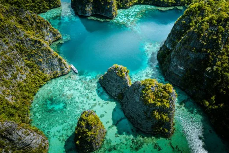 ✓ Dschungelbedeckte Küsten und Korallenatolle: Nur per Schiff vom Meer aus erreichbar