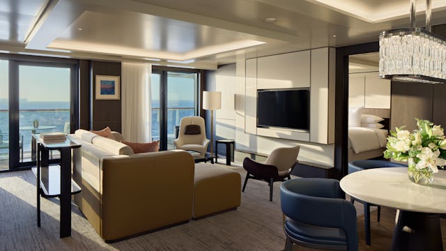 Auf rund 27 m² vereinen die Terrace Suites schlichte Eleganz mit zeitgenössischem Design und bieten alle luxuriösen Annehmlichkeiten, die die Suiten an Bord auszeichnen. Durch die bodentiefen Fenster fällt bereits am Morgen das sanfte Licht des Ozeans ein, während Sie in Ihrem maßgeschneiderten Kingsize-Bett erwachen und den neuen Tag willkommen heißen. Das stilvolle Badezimmer schafft eine Wellness-Oase, in der Sie sich nach einem ereignisreichen Tag an Land oder auf See erfrischen können. Für noch mehr Platz lassen sich ausgewählte Terrace Suiten mit einer benachbarten Suite verbinden und zu einem erweiterten Wohn- und Essbereich oder einem zweiten Schlafzimmer umgestalten – perfekt für Familien oder Gäste, die gemeinsam reisen.