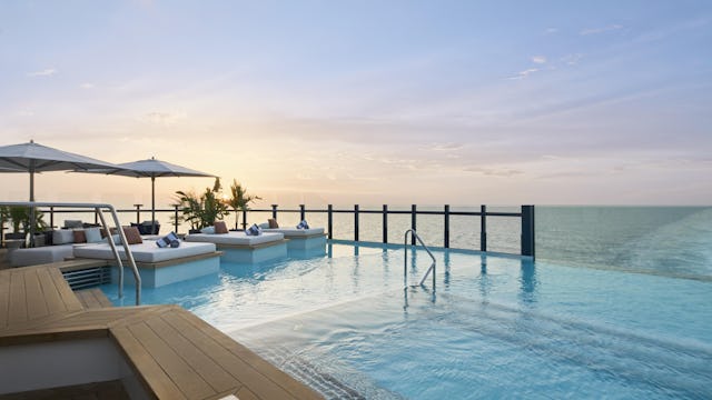 Auf Deck 10 befindet sich der großzügige Main Pool mit Panoramablick, Sonnenliegen und einer Poolbar – ideal für gesellige Veranstaltungen unter freiem Himmel. Die Observation Terrace auf Deck 9 lädt mit komfortablen Liegen und Sofas zum Sonnenbaden oder geselligen Beisammensein ein, während Sie den weiten Meerblick genießen.