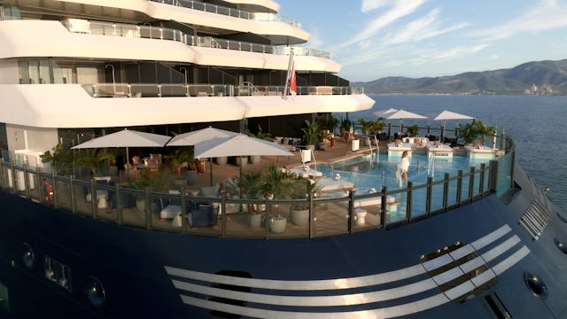 An Bord gibt es eine große Auswahl an Aktivitäten, sowohl an Bord als auch außerhalb des Schiffes. An Bord können Sie die Marina nutzen, einen Bereich am Heck des Schiffes, von dem aus Sie direkt ins Meer springen können, wenn Sie vor Anker liegen. Auf der nahe gelegenen Marina-Terrasse finden Sie zahlreiche Liegestühle, einen Infinity-Pool und zwei Whirlpools.