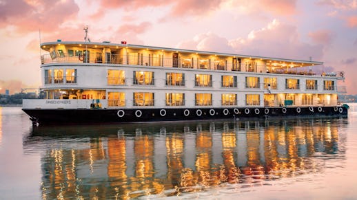 Die geräumigen Suiten des Schiffes mit ihren hohen Decken sind ein ruhiger Zufluchtsort mit wunderschönen handgemalten Wandmalereien und dem Komfort eines Fünf-Sterne-Hotels. Das wunderschöne Design und die prächtige Ausstattung an Bord dieses Schiffes sind von den Farben und der herrlichen Landschaft Indiens inspiriert.