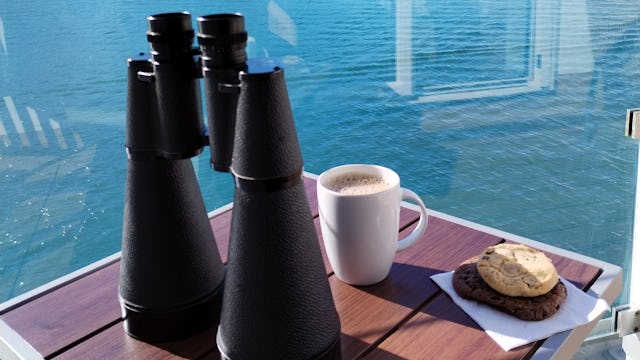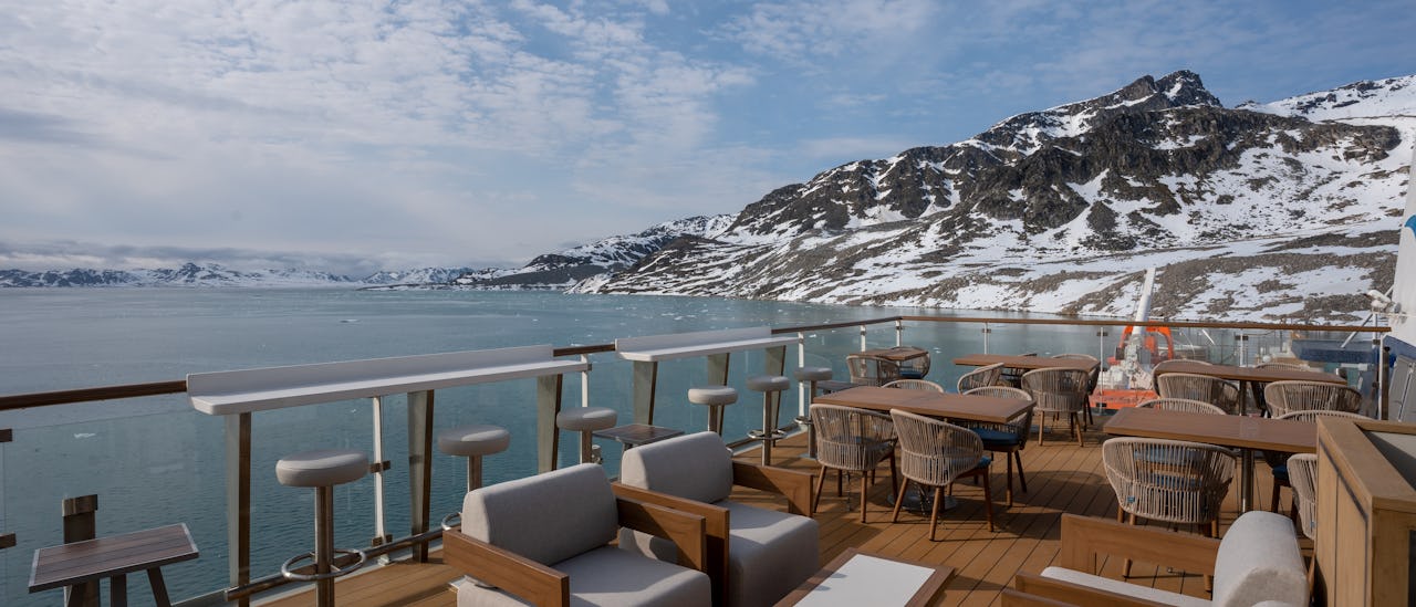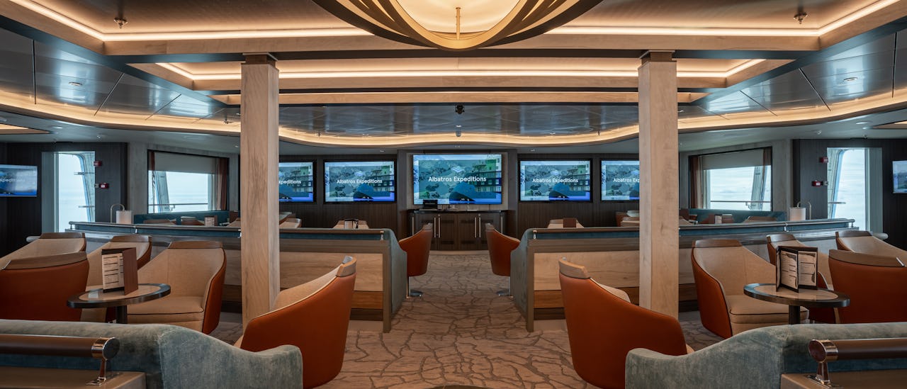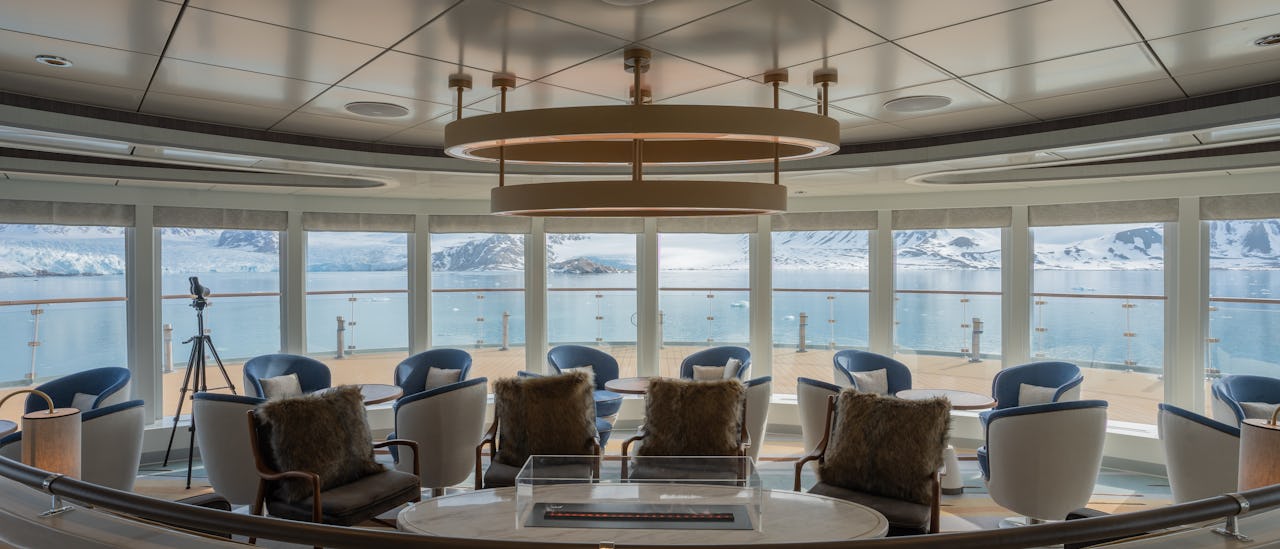 Die Observation Lounge auf Deck 8 bietet mit ihren bodentiefen Fenstern einen ungehinderten Panoramablick auf die weite arktische Landschaft und ist einer der besten Beobachtungspunkte für Wildtiersichtungen.