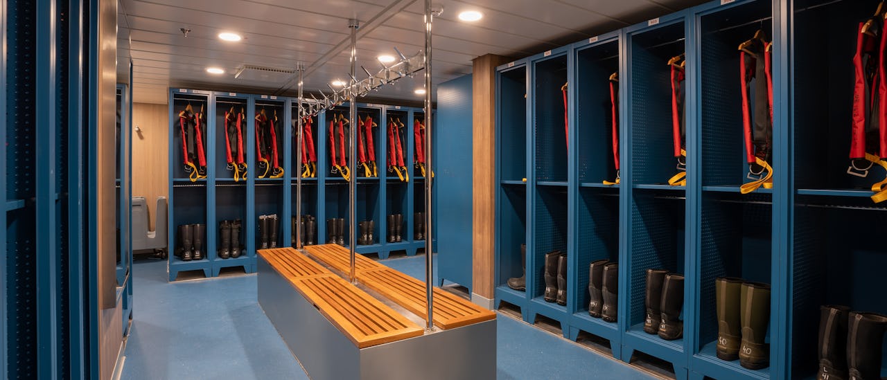 Im Mudroom können sich die Gäste für ihre bevorstehende Zodiac-Fahrt ankleiden. Wasserdichte Kleidung ist Pflicht, um am Expeditionsprogramm teilzunehmen. Passende Gummistiefel werden an Bord zur Verfügung gestellt.