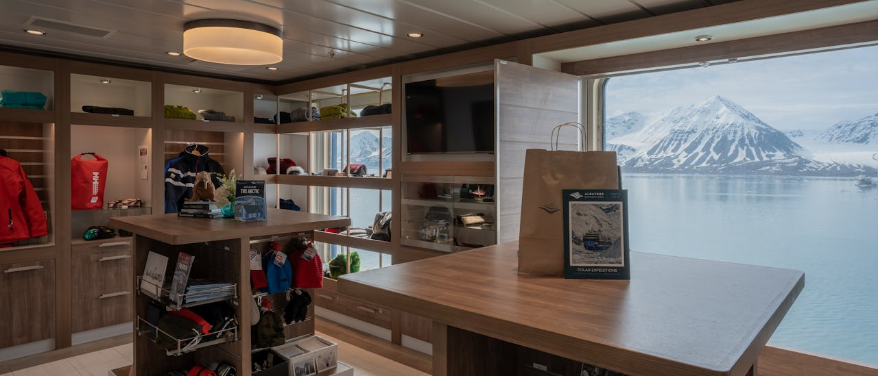 Im Bordshop kann die persönliche Ausrüstung notfalls noch ergänzt werden. Von warmen Parkas, Wolljacken bis hin zu wasserdichten Regenhosen und warmen Mützen bekommt man hier alle wichtigen Expeditionsutensilien.