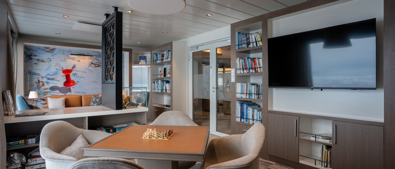 In dem Vortragsraum werden tägliche Meetings für die bevorstehenden Expeditionstage abgehalten. Zusätzlich gibt es spannende Vorträge des Expeditions-Teams von der Geologie Svalbards bis hin zum Jagdverhalten von Eisbären. Warme Getränke und kleine Snacks stehen hier rund um die Uhr kostenfrei zur Verfügung.